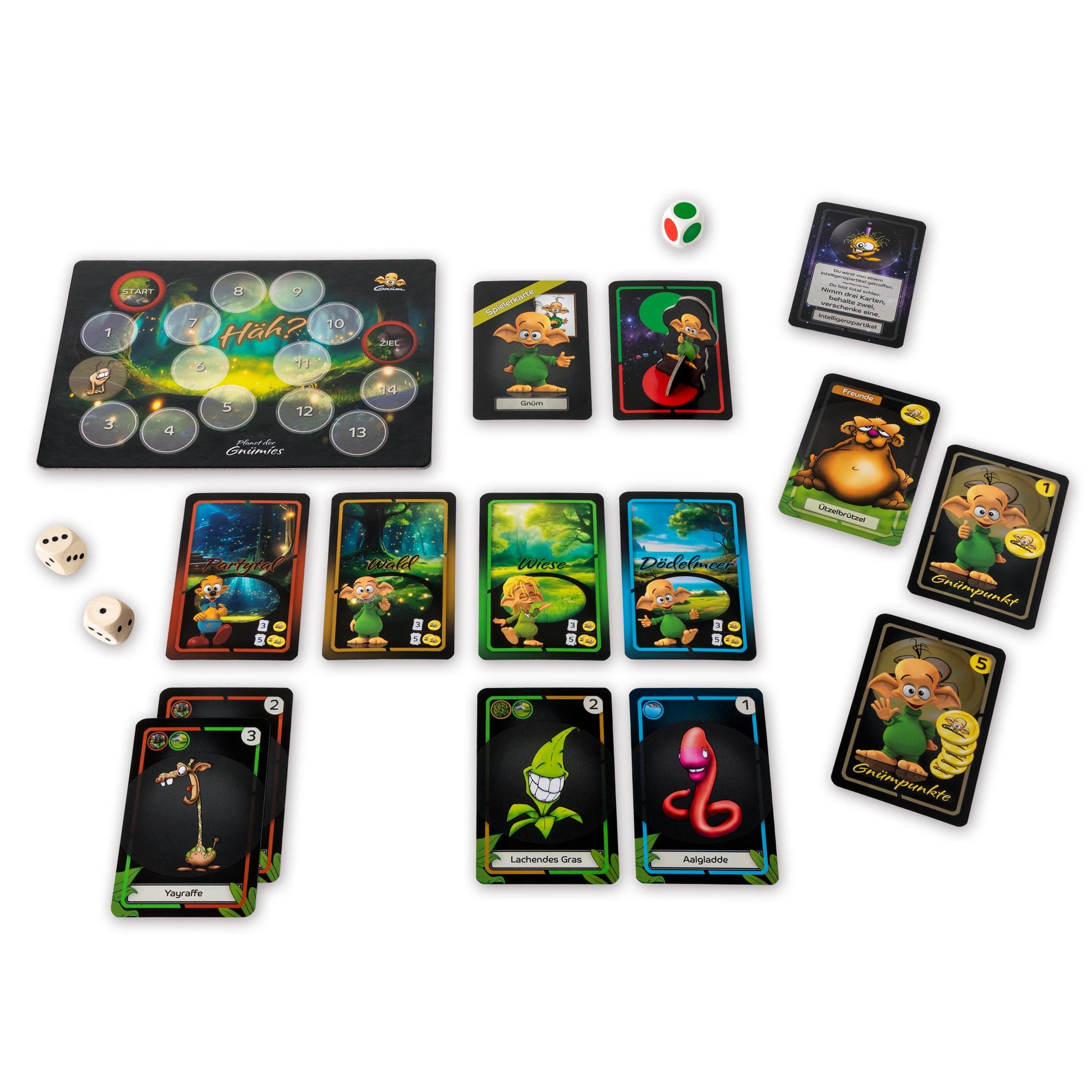 Ziel des Spiel ist es, möglichst viele Gnümpunkte zu sammeln. Gegen- und miteinander treten die Hauptcharaktere Gnüm, Janignüm, Opa Gnümsen und Dischey an. Punkte werden gesammelt, indem man Lebewesenkarten zieht, deren Knubbelpunkte addiert und gegen Gnümpunkte eintauscht. Dafür müssen die Lebewesen den eigenen Geländekarten zugeordnet werden. Aber Achtung, hier heißt es schlau sein: Ob Wald, Wiese, Meer oder Partytal, jedes Lebewesen fühlt sich nur in den farblich richtig markierten Landstrichen wohl – und wenn es dort zu voll wird, sind alle Punkte weg! Wer Karten ziehen darf, entscheidet der rot-grüne Würfel. Egal wer würfelt, eine Chance auf eine Karte haben alle, die bei der Ampel auf die richtige Farbe gesetzt haben. So ist für alle immer was los.